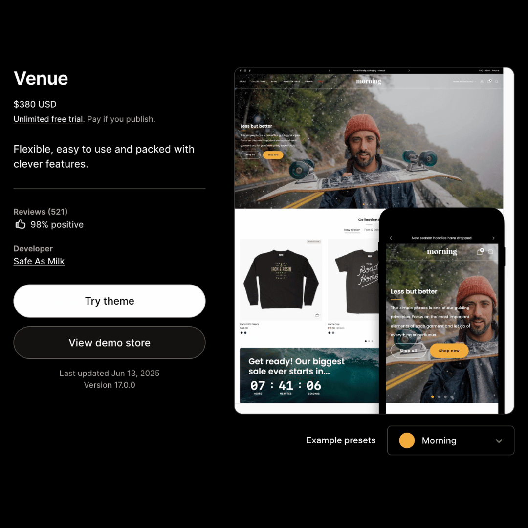 - Shopify – zentrales Shopsystem (Theme: Venue)